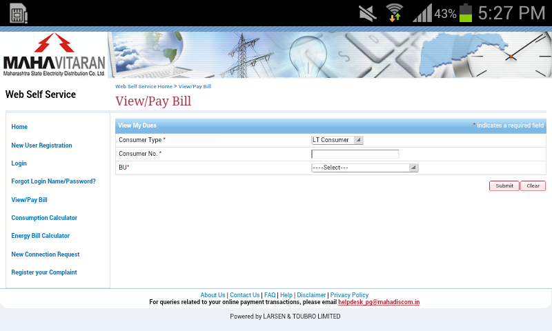 View & Pay Current Bill View your Bill History Enquiry on Bill History View Online Payment History (new) View Consumption Pattern Graph Maharashtra State Electricity Distròution Co. Ltd . Title:: MAHADISCOM - Maharashtra State Electricity Distribution Co. Ltd :: ... View Document